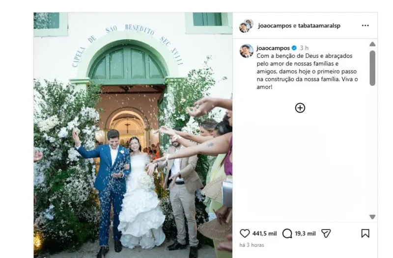 Casamento de João Campos e Tabata Amaral reúne Geraldo Alckmin e Alexandre de Moraes em Pernambuco
