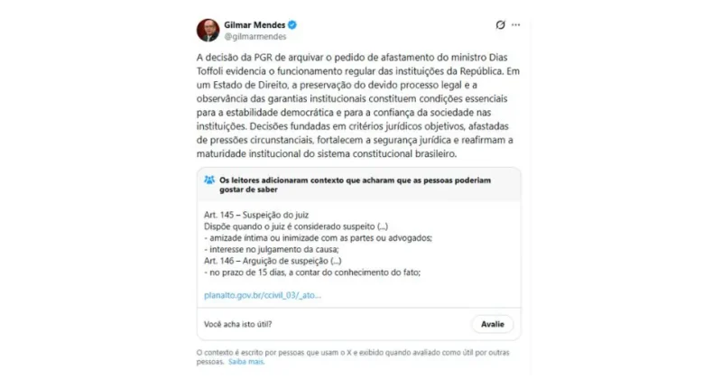 Uma postagem do ministro do Supremo Tribunal Federal (STF), Gilmar Mendes, na rede social X (antigo Twitter), recebeu uma nota da comunidade nesta quinta-feira, 22 de fevereiro de 2026. A publicação de Mendes celebrava o arquivamento, pela Procuradoria-Geral da República (PGR), de um pedido de afastamento do ministro Dias Toffoli do chamado Caso Master, que envolvia alegações de suspeição.